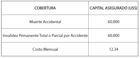 Cubre el fallecimiento por accidente y la invalidez permanente, total o parcial, por accidente hasta los 65 años de edad.