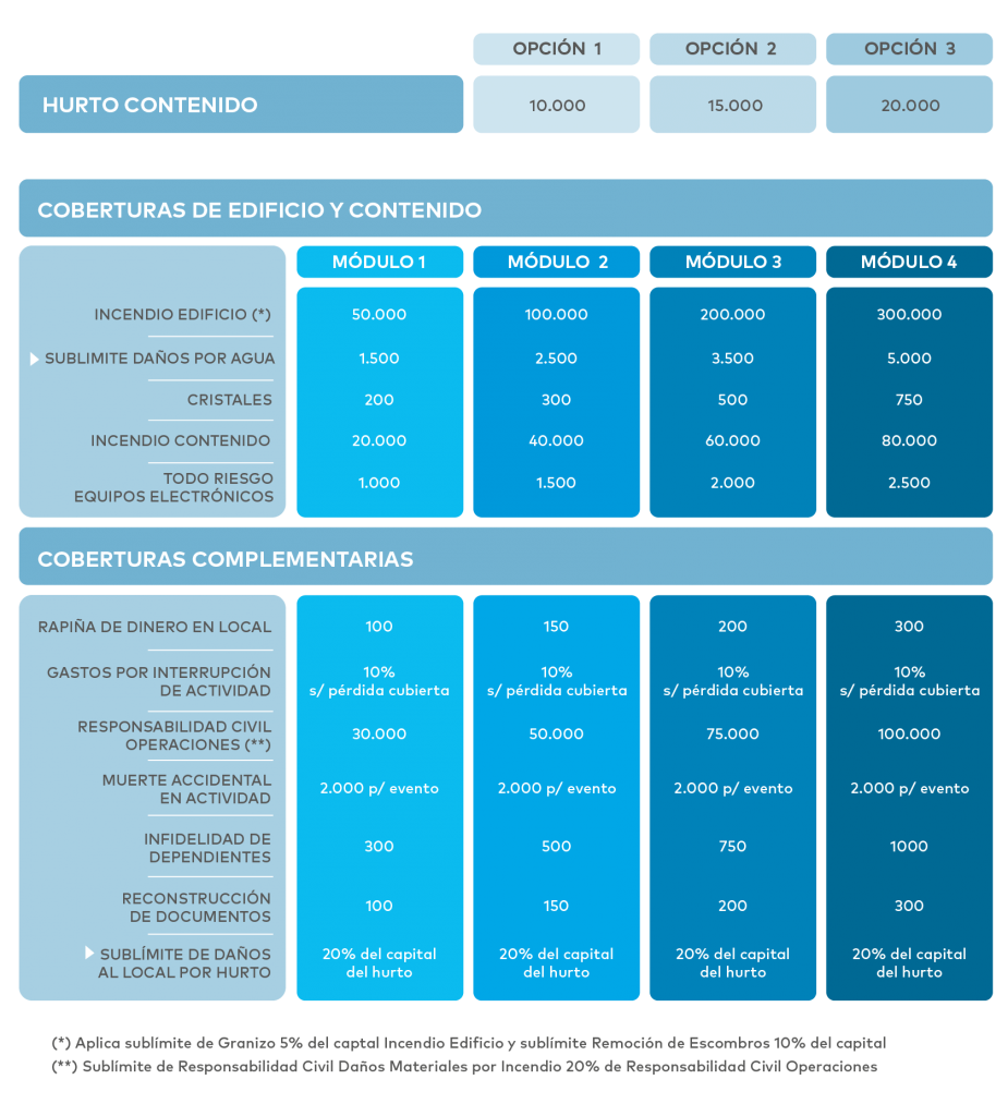 Seleccionando una de las tres opciones de cobertura por hurto de contenido y una de los cuatro módulos de cobertura, obtenemos el costo anual del producto en dólares.